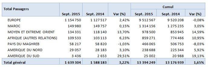Avec 1 489 324 passagers, le trafic aérien commercial international a enregistré en septembre 2015 une hausse de 3,54% par rapport à la même période de l’année précédente.