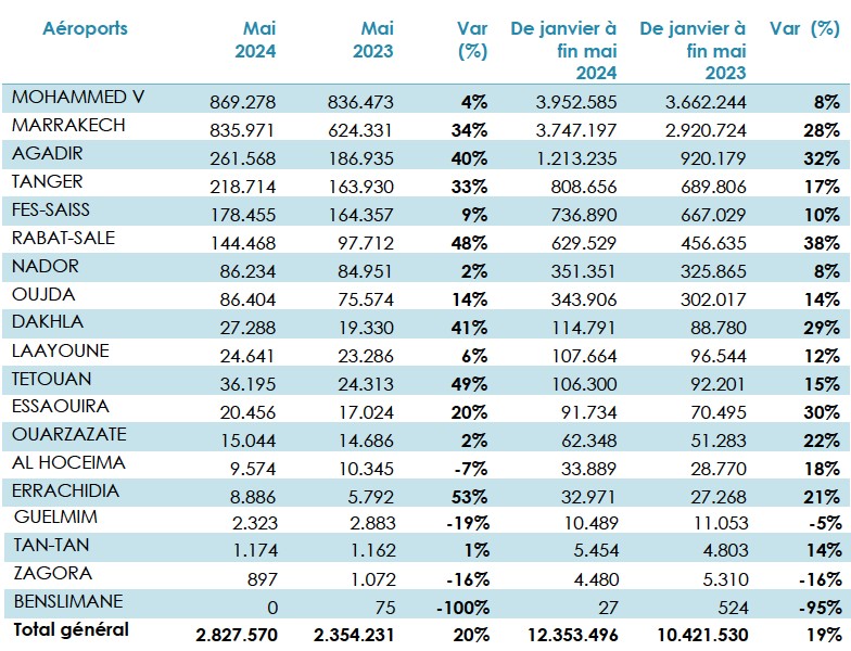 L'aéroport Mohammed V a accueilli 869 278 passagers en mai 2023, ce qui représente 31% du trafic global et une progression de 4% par rapport à l'année précédente. De même, la plupart des autres aéroports ont enregistré une forte croissance, notamment Rabat Salé (+48%), Agadir Al Massira (+40%), Marrakech-Menara (+34%), Tanger Ibn Batouta (+33%), Oujda Angads (+14%) et Fès Sais (+9%).