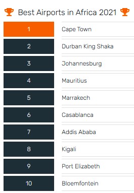 En Afrique, l'aéroport de Marrakech est suivi directement par l’aéroport Mohammed V de Casablanca qui se trouve en 6ème position. Les aéroports marocains sont devancés par l’aéroport du Cap (1er en Afrique, 33ème mondial), qui domine le classement, suivi par ceux de Durban (52ème mondial) et de Johannesburg (54ème mondial) tous en Afrique du sud. En 4ème position se trouve l'aéroport de l'île Maurice.