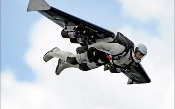 Le pilote suisse Yves Rossy a réussi mercredi 14 mai 2008 devant la presse un vol avec une nouvelle aile en carbone fixée sur son dos, renouvelant son exploit de 2004 qui lui a valu le surnom "d'homme à réaction".